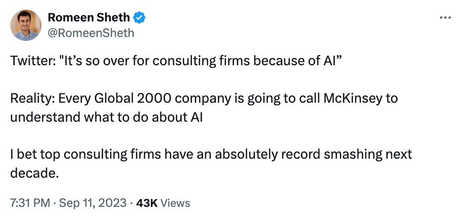 From a demand side perspective, the opportunity is quite obvious, so I will keep this brief. Everyone is obsessed with Gen AI (especially CXOs). They desperately need help to ensure they don’t fall short and their stock price doesn’t tank, and so, they turn to consulting companies for whom this is the next big revenue driver. This includes consultants such as Bain and BCG, and technology implementation partners like Infosys.